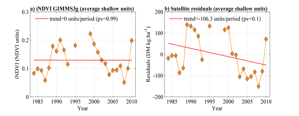 By construction, if one assumes that the relationship between ANPP and rainfall is linear, the ANPP residuals are independent from rainfall. Therefore, significant temporal trends in the residuals truly show changes in vegetation production which are not related to rainfall. These trends in the residuals may be positive or negative, and reflect changes in vegetation composition, land cover (to name a few), and finally indicate land degradation [4]. Moreover, the ANPP residuals can be examined to look for a non-random distribution and possible dependency of residuals on rainfall amount [2,7,27,30]. Indeed, if the hypothesis of a linear relationship between ANPP and rainfall does not hold, it should be evidenced by the shape of the distribution of RUE plotted against rainfall. The ANPP residuals approach is usually recommended rather than the RUE one. In this study, however, both methods are investigated so that possible false interpretations found with the widely used RUE method can be identified.