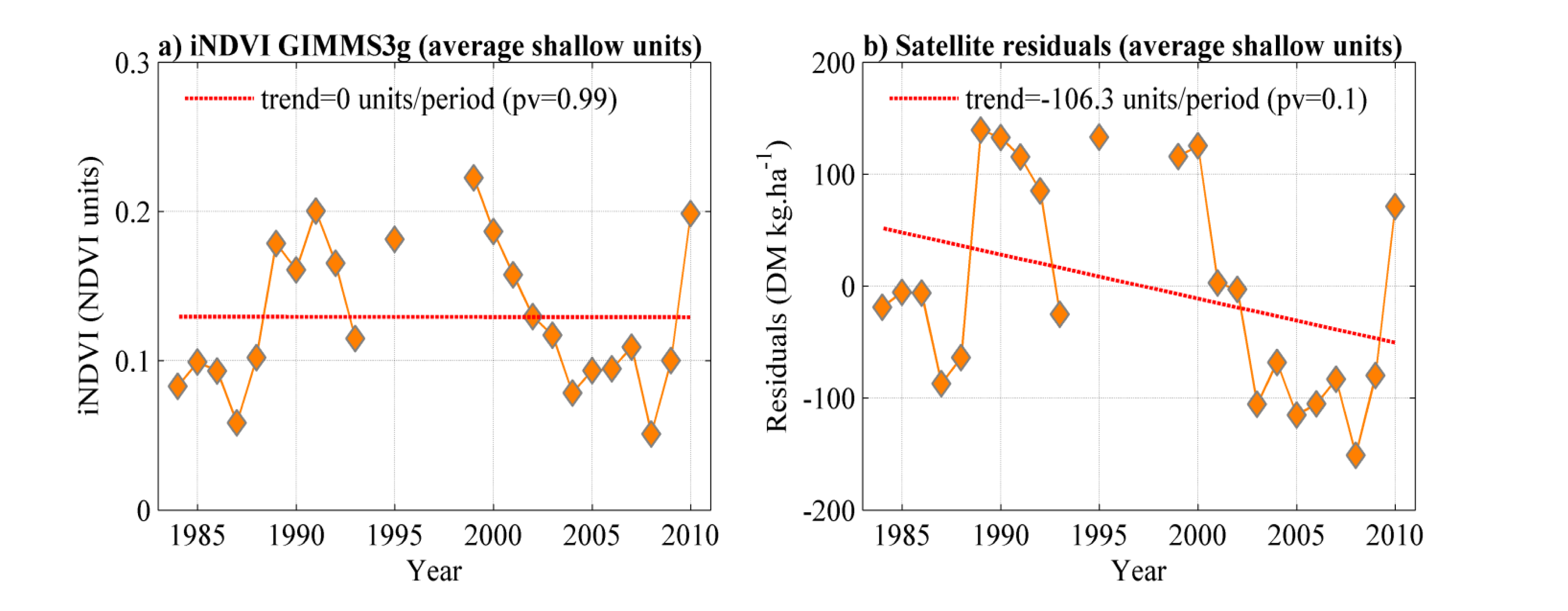 Temporal trends over the period 1984–2010 are calculated using Ordinary Least-Square regressions for each of these datasets (RUEfield, RUEsat, field residuals, satellite residuals). Their relationship with rainfall is examined as well.