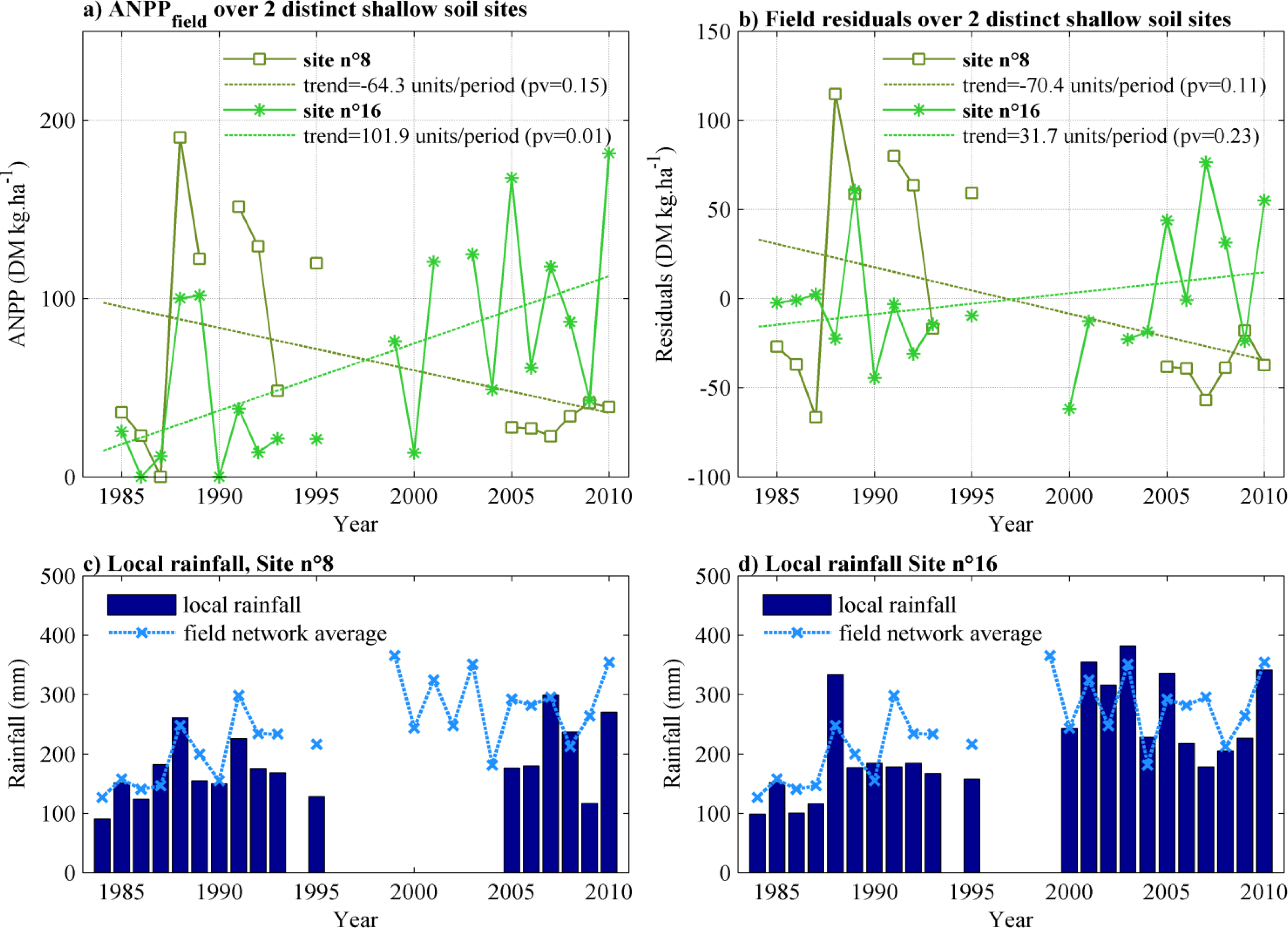 Figure 10. (a) ANPPfield and (b) field ANPP residuals over two specific shallow soil sites (1 km2) close to the Sh1 and Sh2 shallow units (see Figure 1 and text for more details). ANPP residuals are calculated using rainfall from the nearest gauges (referred to as “local rainfall”) for (c) site n°8 and (d) site n°16, and are compared to the window-averaged rainfall (referred to as “field network average”).