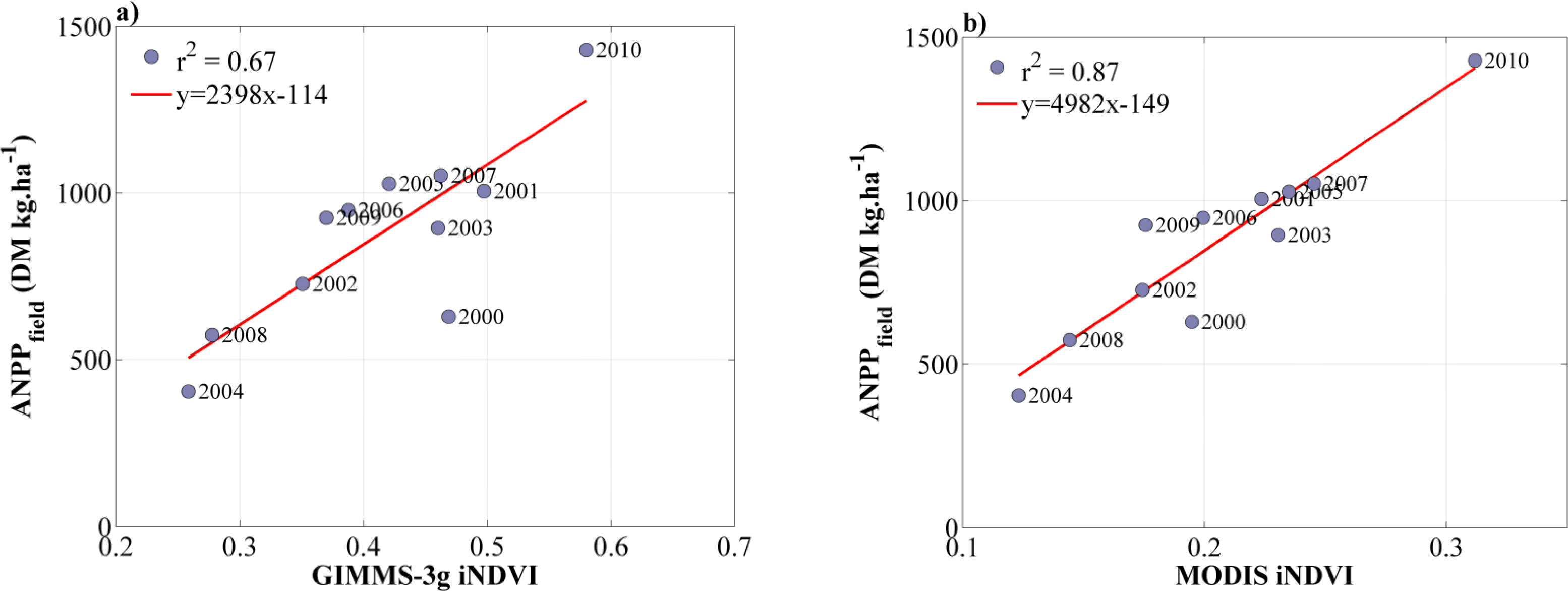 Figure A3. Linear regression performed over 2000–2010 between ANPPfield and iNDVI derived from (a) GIMMS-3g data and (b) MODIS MOD13C2 data.