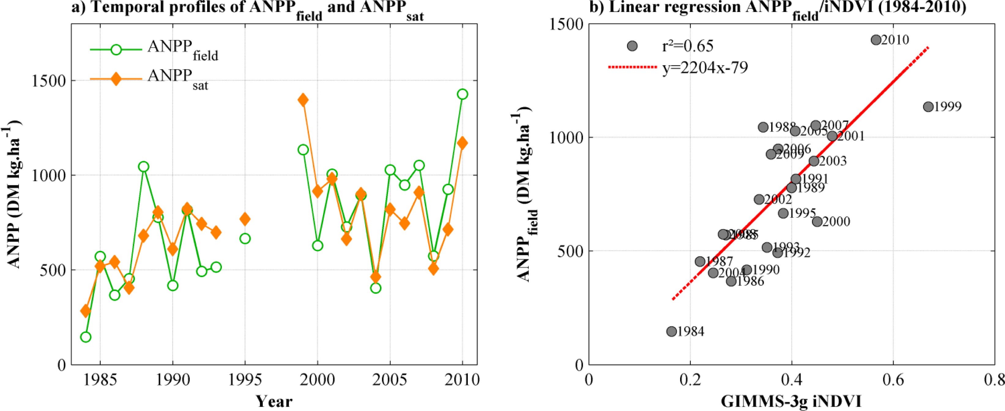 Figure 3. (a) Time series of ANPP derived from field data and satellite data aggregated at the scale of the Gourma window. Years without field data are not considered. (b) Scatterplot and linear regression of field ANPP against integrated NDVI from GIMMS-3g (illustrates Equation (1)).