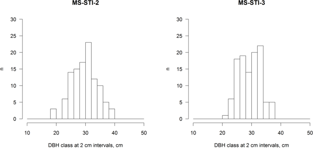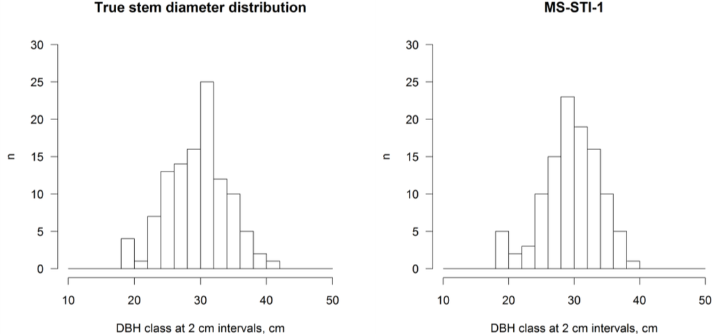 where fi is the true and f̂i is the predicted stem number in class i, k is the number of classes or bins and N is the true and N̂ the predicted stem number of all diameter classes. A bin size of 2 cm was used for diameter and 1 m for height. The error index is modified from the one suggested by Reynolds et al. [41]. Frequency differences are multiplied by 0.5 in Equation (1) to scale the error index to between 0 and 1, 0 meaning a perfect fit and 1 meaning that the distributions do not overlap at all.