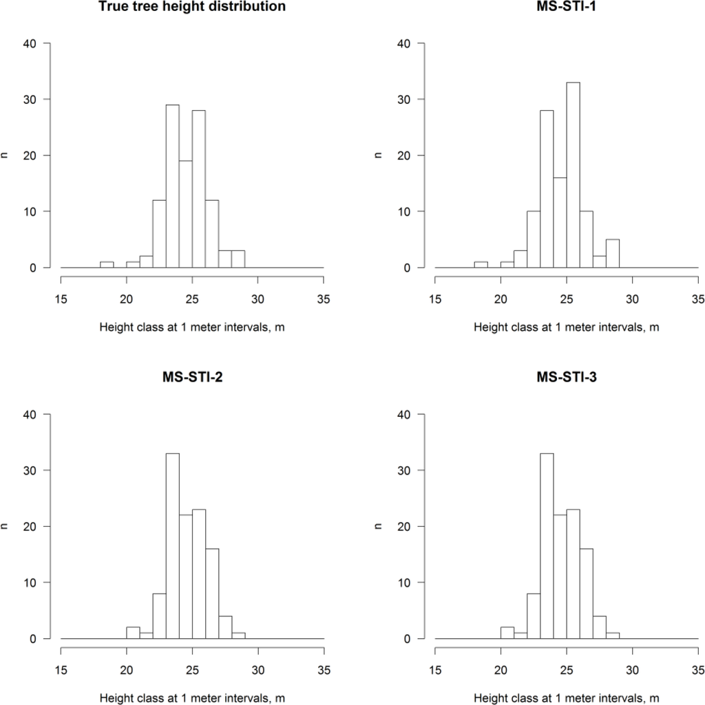 All of the MS-STIs provided accurate estimates for saw log and pulpwood recoveries at the stand level. MS-STI-1’s saw log recovery estimate differed by only 0.2% from the true harvester-measured recovery. The respective difference in pulpwood recovery was 2.7%. Saw log recoveries with MS-STI-2 and MS-STI-3 differentiated −0.4% and 1.3%, as the respective differences in pulpwood recoveries were 10.6% and −3.0%. MS-STI-1 and MS-STI-2 provided the most accurate stem-diameter distribution (Figure 2), while the MS-STI-1 was clearly most accurate in predicting tree-height distribution (Figure 3). Error indices for the predicted diameter distributions were 0.10, 0.11 and 0.15 for MS-STI-1, MS-STI-2 and MS-STI-3, respectively. The error indices for the predicted height distributions were 0.06, 0.10 and 0.15 for MS-STI-1, MS-STI-2 and MS-STI-3.