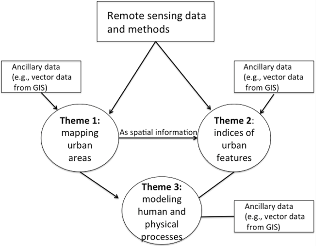 The goal of this paper is to synthesize the current state of urban remote sensing science and assess how it can support the growing demand for information about the urbanization process and cities as places. We differentiate our review from others urban remote sensing reviews (see [3,4]) by focusing on how remote sensing can support global environmental change research and policy formation. Furthermore, while occasionally mentioned, photogrammetric data and methods are beyond the scope of this paper. Urban remote sensing science is shifting from tradition of data processing to become a foundational role in global environmental change. We focus our review on mapping, indices, and modeling, three interrelated themes (Figure 1). We begin our review by describing how remotely sensed data, with a wide variety of spatial, temporal, and spectral ranges, are used to map key environmental features of urban areas. This is followed by a discussion on representative indices of urban areas. The subsequent section then explores how the classified images and the indices are used to model physical and social processes. We conclude our literature review by addressing overarching gaps in the knowledge and highlight concrete steps to move forward.