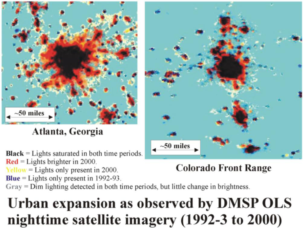 The most common data sources for classifying the urban extent include optical sources such as the sensors IKONOS, Landsat, and SPOT. Using hard classifiers, whole pixels are classified as “urban” based on the spectral signature of impervious surface materials, as reflected from roads and buildings. More recently, data sources such as synthetic aperture radar (SAR) and nighttime lights (from the Defense Meteorological Satellite Program–Operational Linescan Program (DMSP-OLS)) are being used to identify the urban boundary [8–12]. Urban structures, including structure height, can be retrieved via SAR data to identify urban change. Likewise, nighttime lights provide input for measuring the rate of change from undeveloped to developed land when inter-calibration methods are used for consistency in multitemporal images [13]. While lights appear in rural human settlements, which are altered landscapes that are less urban; there is a higher brightness factor in urban areas (Figure 2). DMSP OLS data more accurately identify urbanization in developed countries, but are less accurate in developing countries [14].