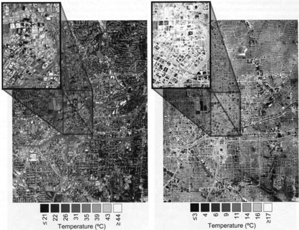 One key challenge with thermal data is that the spatial resolution of these data has not kept pace with the detailed resolution of land cover mapping data sources, which are used to quantify the drivers of temperature variations. Data sources such as Quickbird and WorldView-1, -2 with meter and submeter spatial resolutions along with object-oriented classification methods are commonly used to create high resolution land cover maps. Studies such as [60] demonstrate that surface temperatures vary depending on the spatial clustering or fractions of land cover types. These observations suggest a need for higher resolution thermal mapping to better understand the complex relationship between the drivers and variations of the thermal surface. Airborne thermal mapping, with ∼4 m and finer spatial resolution, offers the potential for high resolution access to thermal imaging for urban areas but these sources are less available than sensors on satellites [61]. This is illustrated in Figure 3 [62] where high spatial resolution (10 m) thermal infrared data are used to quantify daytime and nighttime surface temperatures in the Atlanta, GA central business district. Individual building rooftops can be discerned from these data which is not possible from coarser resolution thermal infrared satellite data (e.g., Landsat, ASTER, MODIS).