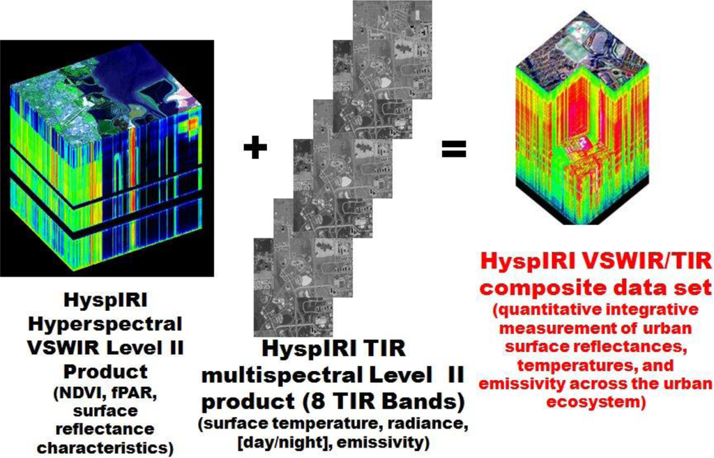 To address scale issues, there are plans for obtaining finer spatial and spectral resolution data to improve remote sensing observation and analysis of urban areas. For example, the Hyperspectral Infrared Imager (HyspIRI) which is planned for launch later this decade, will have a hyperspectral Visible and ShortWave Infrared (VSWIR) spectrometer with bandwidths of 380 to 2500 nm in 10 nm band increments [162]. It will also have a multispectral thermal infrared instrument with 8 bands in the 3.9–12.3 μm spectral bandwidth. HyspIRI will have a spatial resolution of 60 m and a repeat cycle of 16 days, with the capability of acquiring both daytime and nighttime measurements. The VSWIR and thermal infrared data obtained by HyspIRI can be used to provide integrated higher level datasets for use in developing detailed quantitative information on spectral responses and surface temperatures for the surface material types that comprise the heterogeneous urban landscape (Figure 5).