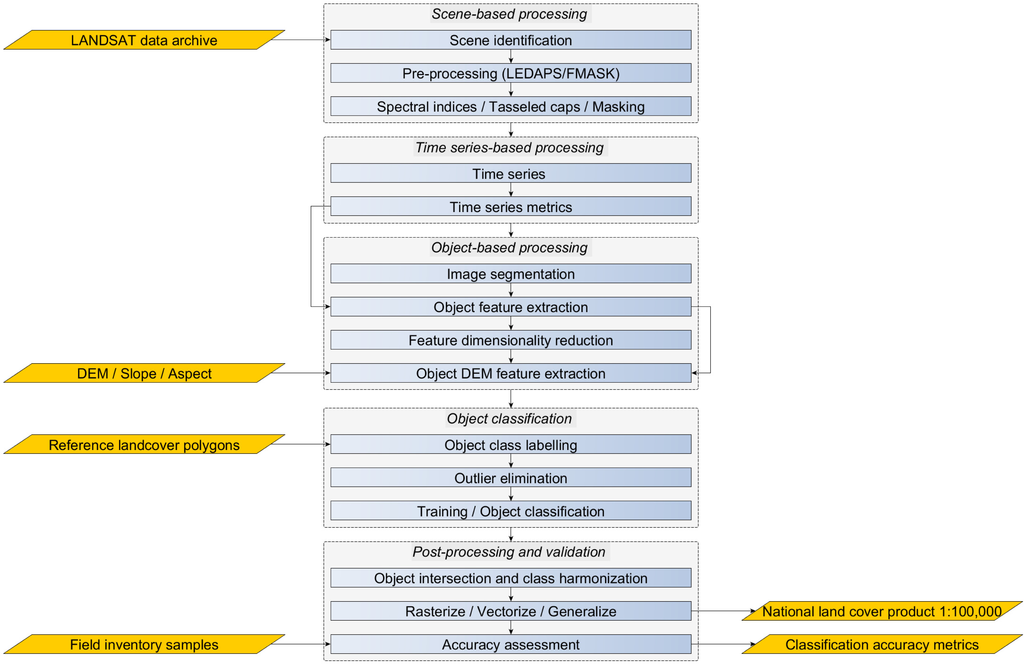 Due to varying numbers of available Landsat images per path/row at different times of a given year, processing was performed on frame stacks with the available Landsat imagery. Figure 2 provides an overview of the individual processes grouped in five general steps. The methodology applies all available satellite imagery over only a few clear observations or even country mosaics to benefit from the full multi-temporal measurements and not to lose that information by temporal aggregation.