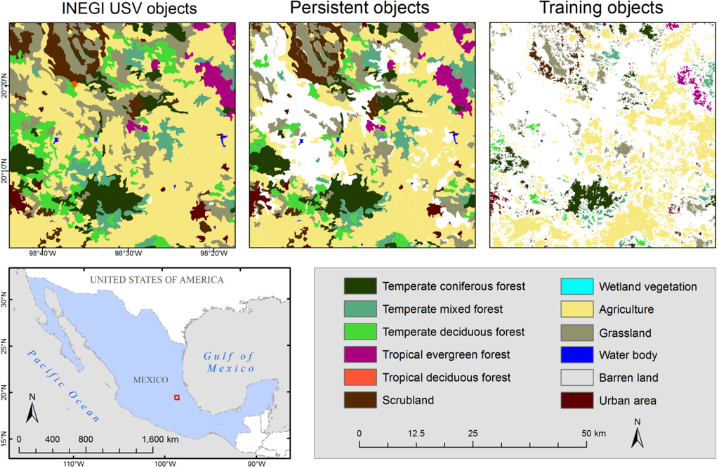 For the historical baseline mapping the complete Landsat archive containing all imagery recorded over Mexico utilizing ETM+ and TM sensor data are used. The classification process follows an object-oriented “Map-to-Image” approach, i.e., utilizing existing cartographic land use information at high thematic resolution as base information for classification training. All available Landsat data are used that meet the defined quality criteria, which is currently a maximum cloud cover threshold of ten percent. However, the cloud coverage threshold has only been applied for the classifications for the years 1993 to 2000. Multi-temporal metrics are calculated on pre-processed Landsat scenes for a given year. Image objects are derived by image segmentation and object features are extracted from the multi-temporal metrics. Initial thematic mapping against the base land use map is done and forms the basis for classificatory training. Subsequent decision tree classification is performed using the object features. Final product validation and class aggregation is done on independent field inventory data. National land cover products have been processed for the years 1993, 1995, 1997, 2000, 2002, 2005, and 2008.