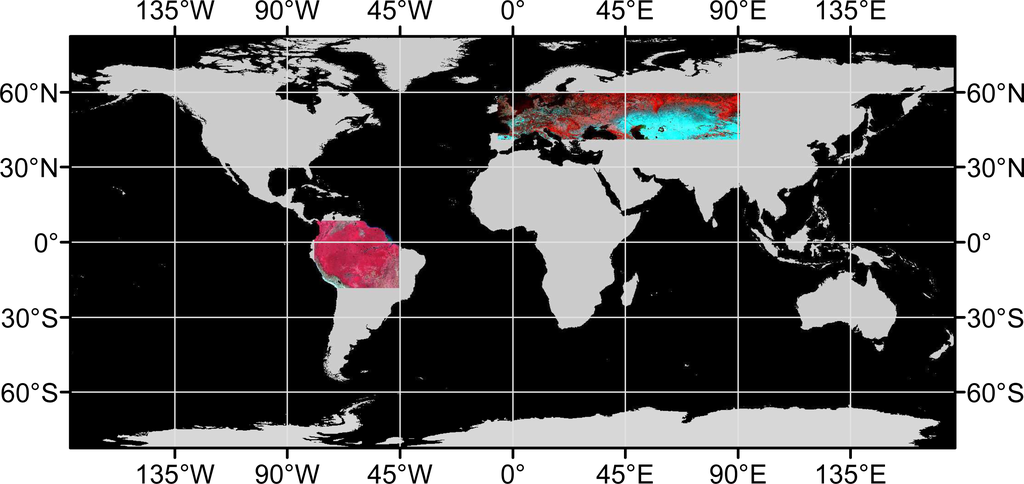 Two study areas have been selected for the comparison of the different training sample extraction methods. The first one covers a large part of Western Eurasia, and the second one includes most of the Amazon basin in South America. Their locations are presented in Figure 1. Approximately one tenth of the global land surface is covered by these two test areas.