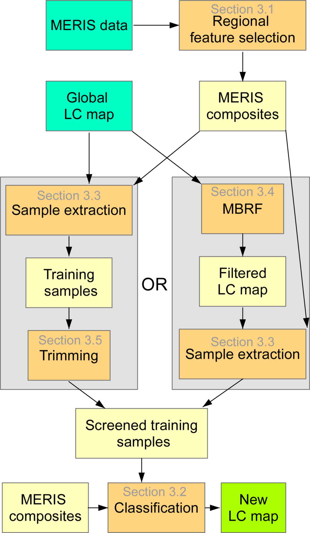 For the ESA Land Cover CCI (LC CCI) project, the scientific challenge of accurate global land cover mapping from satellite observations is addressed by combining the automated unsupervised processing strategy of GlobCover with a locally trained classification approach. This paper focuses on this second supervised strategy.