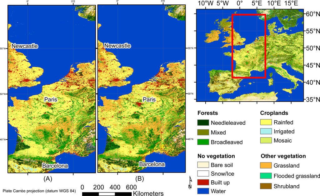 Despite the small differences in overall accuracies, some important macroscopic changes can be highlighted in Eurasia (Figure 5). Obviously, the spatial resolution of some classes has been improved in the areas where GLC 2000 is used as a reference. Furthermore, the city, mislocated in the reference, is correctly located in the classification results.