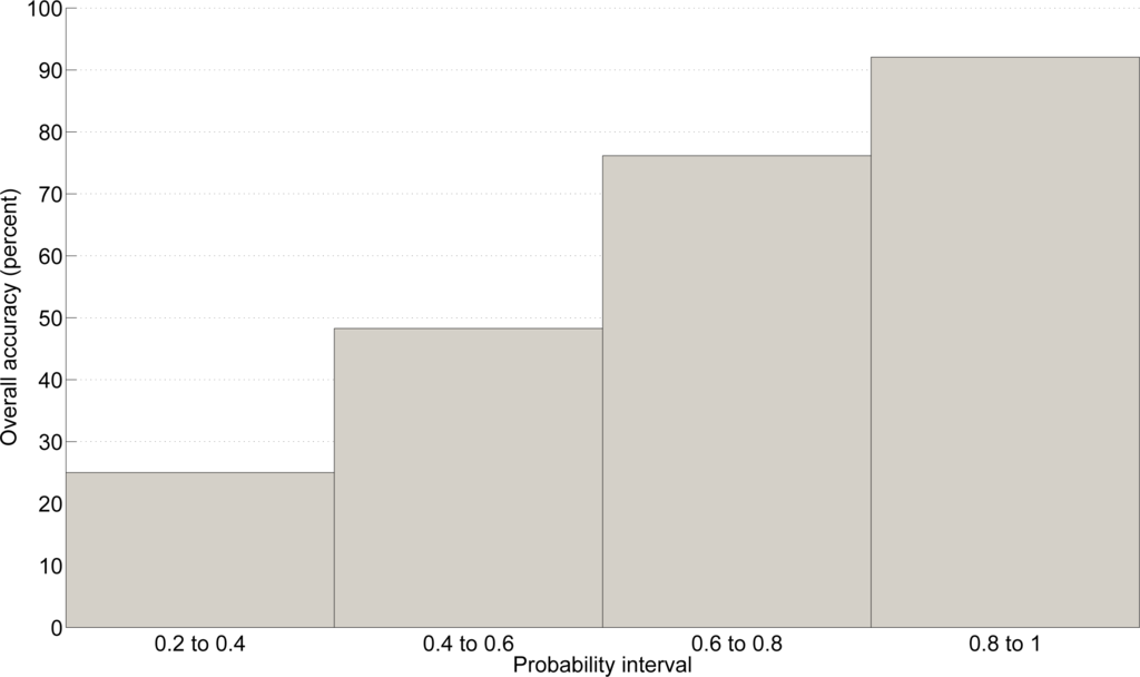 More importantly, the overall accuracy is strongly and positively correlated with the a posteriori probability, as shown in Figure 6. These probabilities appear to be a good indicator of the classification reliability. By thresholding this probability, the most reliable classification results can be selected and the others discarded. In the Eurasian test area, for instance, the overall accuracy of the pixels with a membership probability above 0.6 reaches 85.6%, which is significantly better than the widely accepted 80% target [32] with a 95% confidence level. In terms of coverage, these pixels represent about 70% of the Eurasian region, which is similar to the proportion of the map above 60% confidence in a comparable study in South America [33]. The areas of low probability, colored in grey in Figure 7, should then be processed with alternative classification methods. These are the limits of applicability of the proposed method of automated training sample selection.