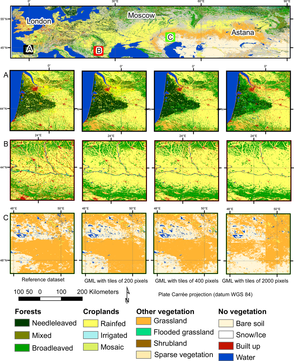 The results of the Eurasian test area (Tables 2 and 3) show a significant improvement in the overall accuracies compared with thematic data used as a training reference. The overall accuracy of the GML classification results is indeed between 2.4% and 5.8% better than the overall accuracy of the reference dataset (65.2%). For the adjusted accuracy, the classification results are on average 2.5% better. These two differences are statistically significant with a confidence level of 99%.
