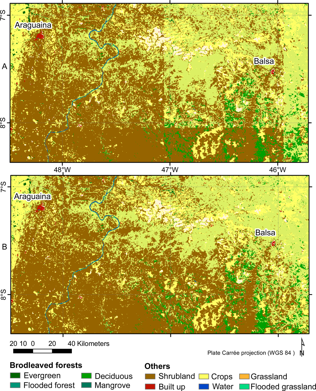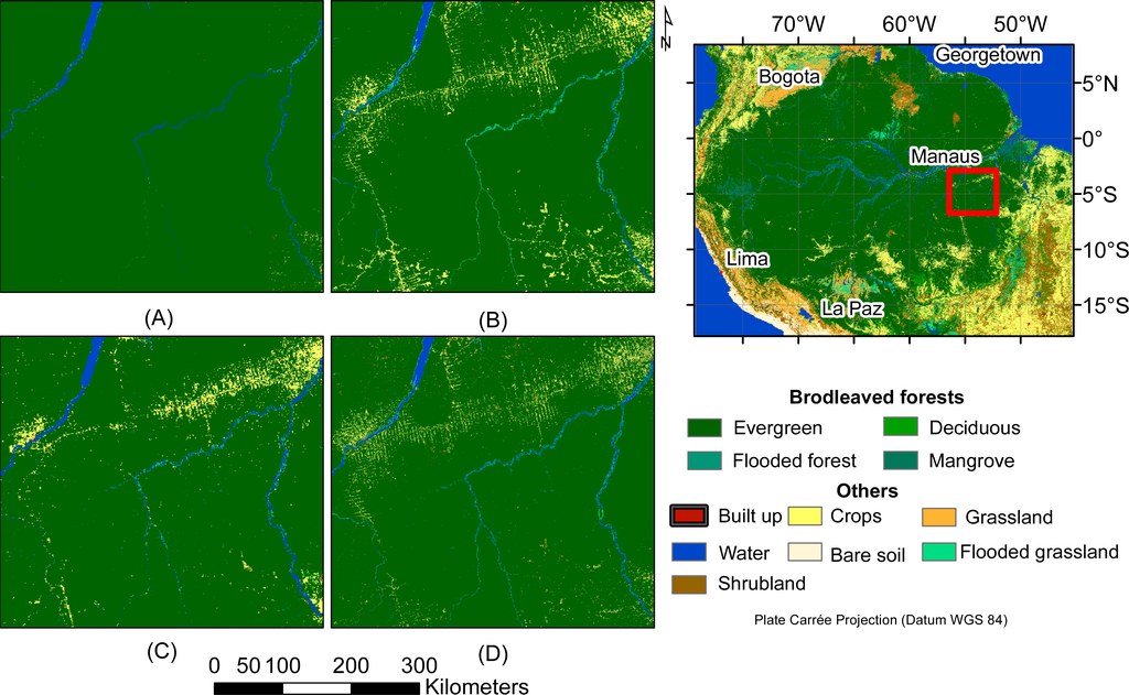 The South American test area includes the largest contiguous extent of evergreen broadleaved forest, part of it being regularly flooded. Mangroves are also present along the Eastern coastline, as well as drier forests and shrublands in the West and the South. Some deforestation patches can be observed where the forest has been converted into pasture or cropland.