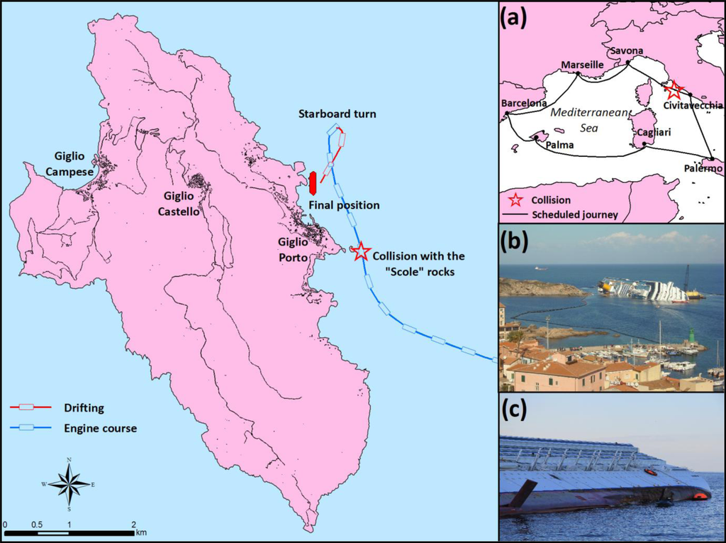 The Costa Concordia cruise ship, with 3206 passengers and 1023 crew members on board, was sailing off Giglio Island on the night of 13 January 2012, having begun a planned seven-day cruise from Civitavecchia to Savona and five other ports in the Mediterranean Sea. At around 21:45 local time, after having changed the scheduled course to pass near Giglio Island, the ship struck its portside on a reef. The reef is charted as an area known as Le Scole, about 800 meters south of the entrance to the harbor of Giglio Porto, on the island’s east coast (Figure 1). The initial impact was at a point eight meters below the water at “Scola piccola”, the most seaward exposed rock of Le Scole, which tore a 50-meter gash in the ship’s portside below the water line. The impact sheared from the ship’s hull two long strips of steel, later found on the seabed 92 to 96 m from the main island. The ship has a large boulder embedded in the hull at the aft end of the impact gash.