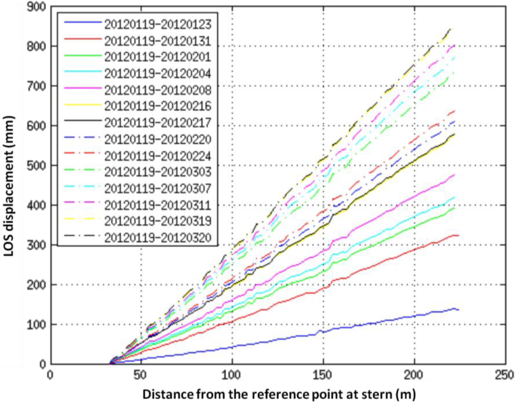 Examples of the cumulative displacement measured along the stern-bow profile for the temporal interval 11 January–20 March 2012, is presented in Figure 4. Each line represents the displacement measured in different time intervals defined by the available acquisitions, taking as reference the image acquired on 19 January 2012.