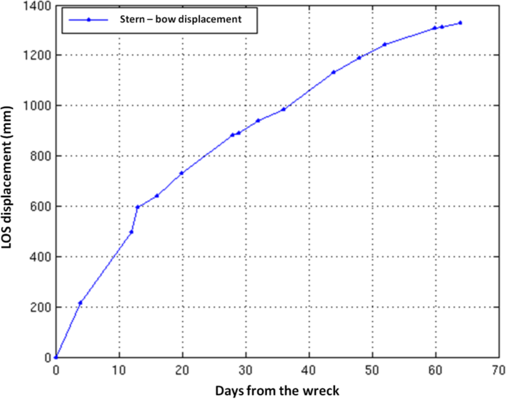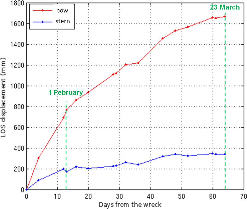 The analysis of the data was primarily aimed at measuring any movements of the wreck with respect to the Giglio coastline. The movements (Figure 6), both at stern and bow, show a continuous (positive monotonic) trend over time (19 January to 23 March 2012).