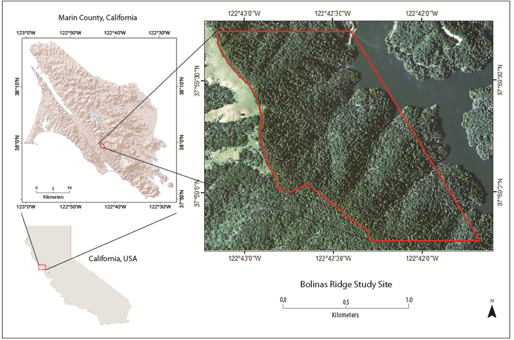 The study area is located on the eastern slope of the Bolinas Ridge above Kent Lake Reservoir in Marin County, California (Figure 1). The site is approximately 3 square kilometers of heavily forested steep terrain, with an average slope of 29° and elevations ranging between 109 and 470 meters above mean sea level. The forest canopy in the study area is primarily characterized by second growth coast redwood and Douglas-fir. Canopy cover is dense and consistent throughout the study site and logging roads within the study site are completely occluded by vegetation (Figure 1).