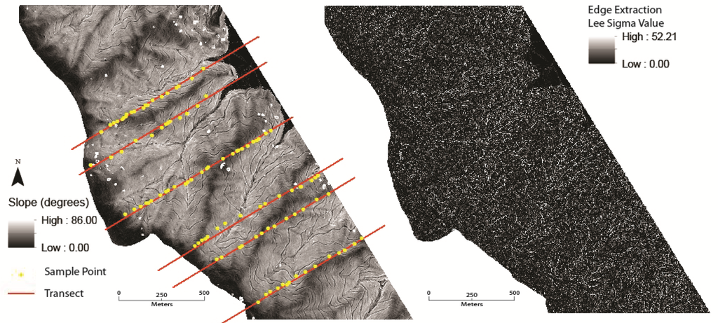 Since logging road maps of the study site were unavailable, a line-intercept field sample was used to gather classification validation points and road characteristics. The field survey was completed over five days between 17 November 2012 and 24 August 2013. Road and non-road points were collected along six transects running from the Bolinas Ridgeline on the western edge of the study site to the eastern edge of the study site. Transect starting points were chosen on the Bolinas Ridgeline in order to cover the entire study site. Originally 200 meter intervals between transects were chosen, but in order to adequately cover the entire study site, it was determined that larger intervals were needed. The exact starting point of each transect was chosen randomly within 100 meter zones. Each transect was then run on a 45 degree angle from the Bolinas ridge trail to the eastern edge of the study site. At each logging road found along a transect, the following road characteristics were collected: width, aspect, slope along road, slope across road, and road position, e.g., within gully, along ridgeline, or following contour. A GPS point was also collected at the center of the road. Non-road GPS points were collected on transects at approximately 100-m intervals to provide non-road validation points. A total of 43 non-road points and 57 road points were collected with a handheld Trimble Juno SB GPS receiver. All GPS points were post-processed with differential correction using reference data from the base provider UNAVCO, Inverness, CA. Despite the stated post-processing accuracy of L1 code of 1–3 m [34], large GPS positional errors can occur in steep forested terrain due to high position dilution of precision (PDOP) and multipath LiDAR returns [35]. A high PDOP indicates that the geometry of the available satellites may lead to positional errors in the resulting GPS points. After a visual inspection of the GPS road points, it became clear that many points were located up to several meters away from their true position. When necessary, GPS road points were moved to the intersection of the corresponding transect and the correct road visually identified on the slope model.