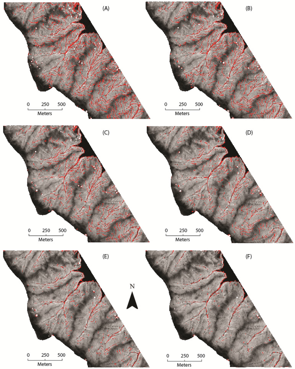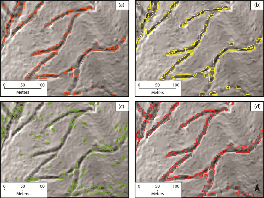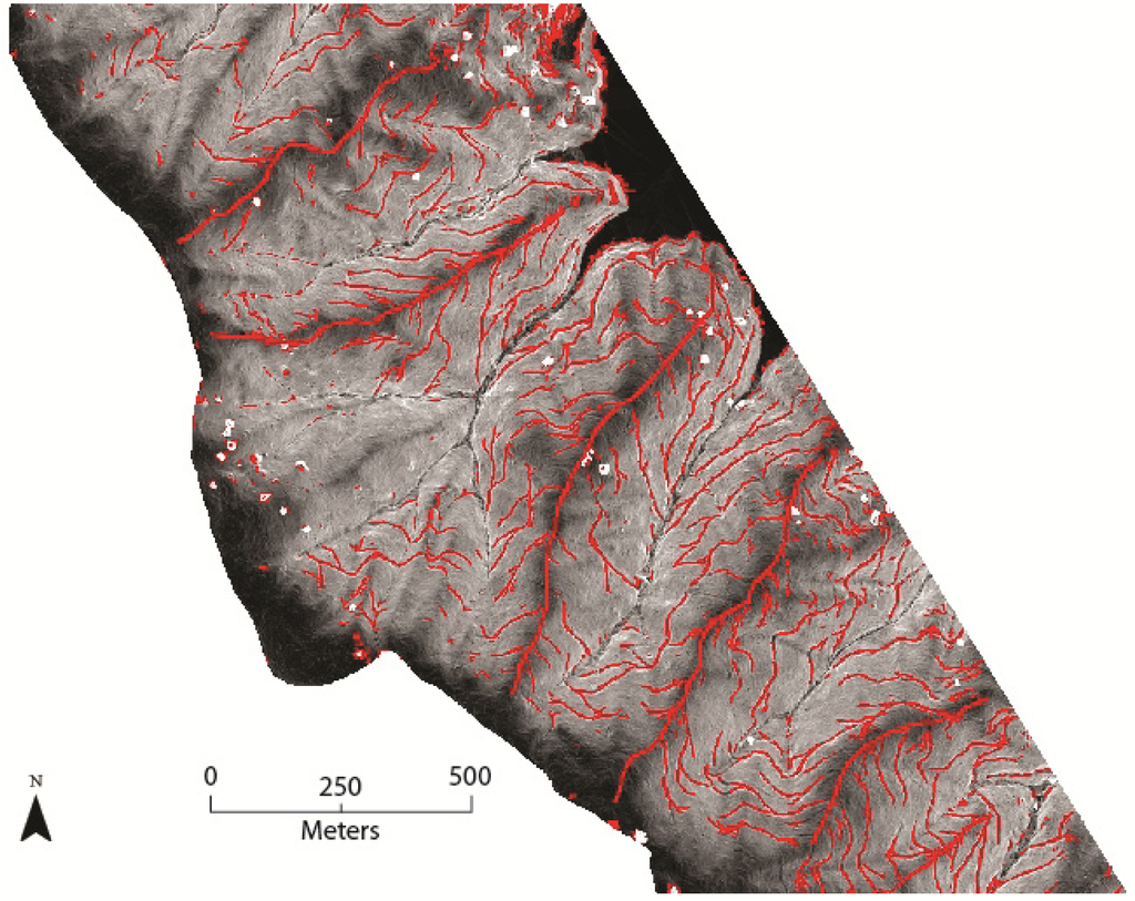 Two levels of post-processing were performed on the results of the object based road classification within ArcGIS 10.1. First, misclassified gullies and streams were removed. A streams layer was created in ArcGIS using the following workflow: LiDAR derived DEM > Flow direction raster > Flow accumulation raster > Streams layer. The resulting stream layer was buffered to 4 meters and used to erase roads falling within natural drainages.