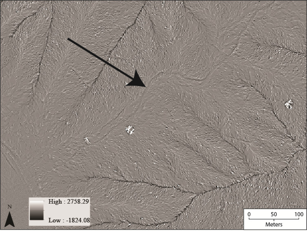 The second post processing level involved hand digitizing ridge roads that were missed by the original object based classification. A plan curvature raster was created from the LiDAR derived DEM using the curvature tool in the Spatial Analyst toolbox [33]. Plan curvature is the rate of change in the flow direction of the surface, following the contour direction. The plan curvature image is helpful in distinguishing ridgelines [37] and ridge roads (Figure 5). Ridge roads visible on the plan curvature image were hand digitized in ArcGIS and joined to the existing classified road layer. Six ridge roads with a total length of 3.9 km were added.