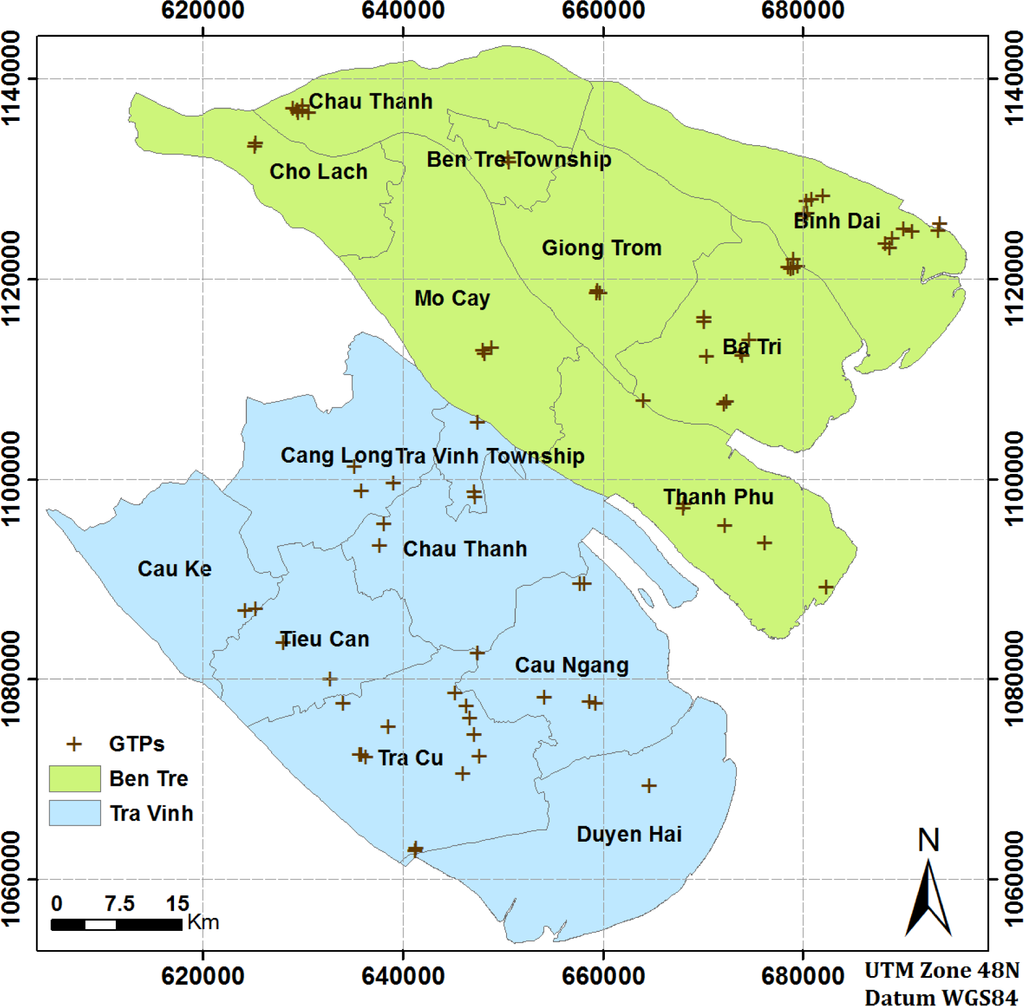 Ground truth data were acquired by a field survey campaign on 7–10 October 2013 in Ben Tre and Tra Vinh provinces. At first, 180 ground truth points were randomly created within the study area. However, ground truth data collection was laborious because all locations need to be visited including the time reserved for discussions with local people. The final number and spatial distribution of ground truth points were limited due to resources, time and road accessibility and 75 points were finally collected (Figure 1). The 75 ground truth points covered all land-use classes included in the classification maps. A higher number of points would be needed for detailed accuracy assessment of each land-use class. However, 75 points was considered to be enough for a rough estimate of the classification accuracy. In addition, farmers were asked about the past changes in land use. The number of various land-use classes included in field survey points is presented in Table 3. Detailed information about the crop cycle and type of each location was acquired by interviewing local authorities and farmers in situ. The accurate location of each field survey point was captured using hand-held Garmin Etrex GNSS navigator with location accuracy less than 10 m.