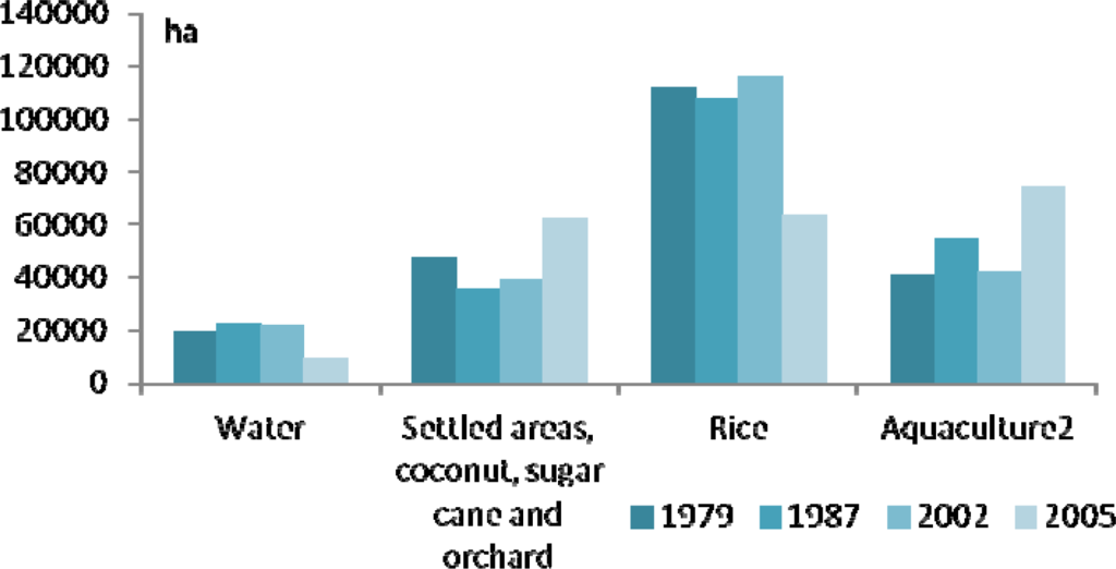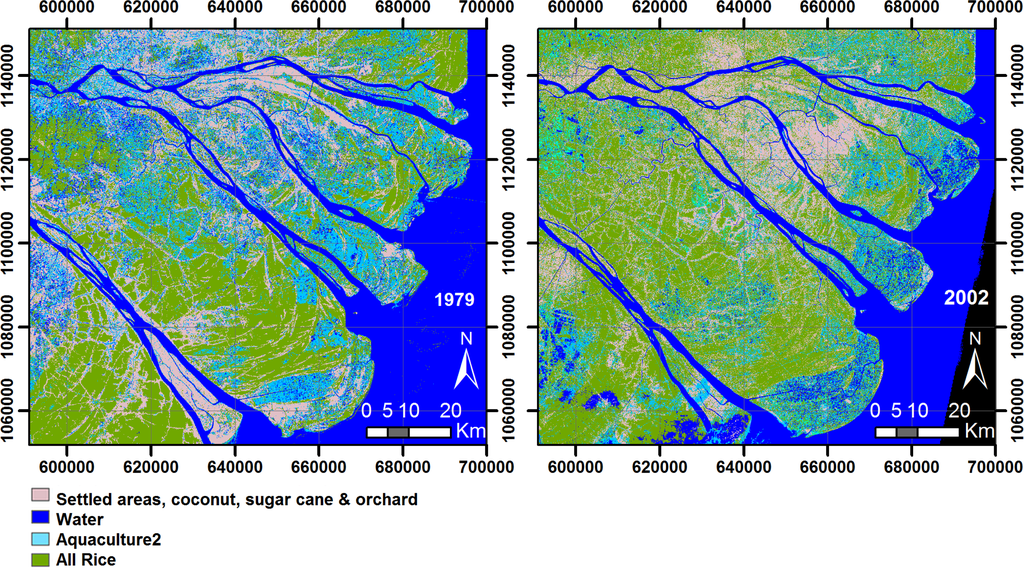 The land-use situation in 1979, 1987, 2002 and 2005, based on the Landsat and SPOT images, is presented in Figure 7. The 1998 SPOT result is not listed as the data is missing for some districts due to the image extent. The results show some decrease in the class “all rice” for 2005; however, the trend appears not to be very clear. The different imaging systems of the Landsat and SPOT satellites and different farming practices in the older data may also affect these results. Some water surfaces were classified into the “Water” class even if they actually belonged to the aquaculture areas, because the single-date images cannot distinguish these classes. Also, floods in the area may affect the results when water is covering other land-uses.