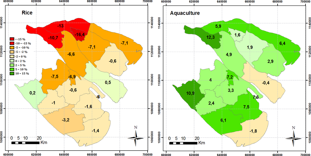 Thematic maps were produced from the classification result based on the SAR data for the classes “All rice” and “Aquaculture” (Figure 5). The change in hectares in comparison to the total area of a district was calculated and the map was colored accordingly. It can be noted that the most significant changes for rice have taken place in the inland districts. According to our experience during the field survey, it is highly possible that land-use changes in the coastal districts had already taken place before the year 2005.