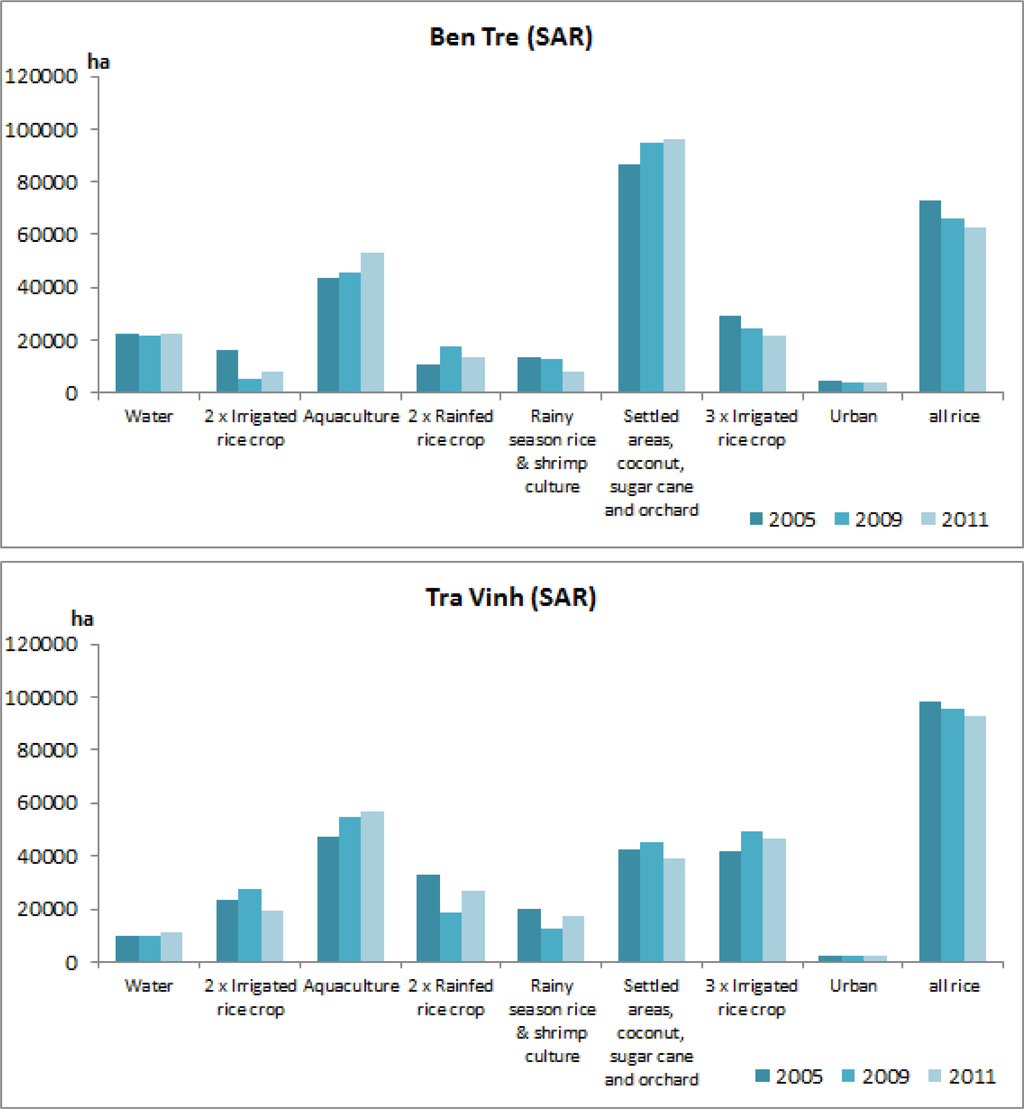 More detailed results on the land-use changes are presented for Ben Tre and Tra Vinh provinces in Figure 6. The 2011 SAR image set was lacking input data in May to December, which may have affected the detection of certain types of rice and the shrimp/rice fields. In Ben Tre, the SAR images show a decrease in the total rice acreage and increase in the aquaculture acreage. The acreage for “Settled areas, coconut, sugar cane and orchard” has increased as well. In the Tra Vinh province, the SAR images show a decrease in the rice acreage and an increase in the aquaculture acreage as well. The classes “Water” and “Urban” did not change remarkably between 2005 and 2011.