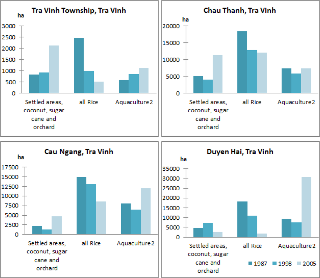 In Figure 8, the SPOT results (1987, 1998, 2005) for four districts in Tra Vinh are presented. Duyen Hai is a coastal district and aquaculture has clearly increased there as rice acreage has decreased. The trend is notable in the other three districts as well.