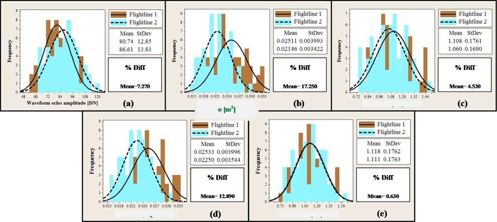 The results for σα (Figure 3d) show a reduction in the mean and standard deviation differences as compared with σ in Figure 3b. However, the results of γα deliver a near-perfect match between overlapping flightlines, as highlighted in Figure 3e and demonstrated through small mean and standard deviation differences. Although the target was selected to be as horizontal as possible, it seems that it is not a perfectly flat surface and the incidence angle is still affecting the received signals as demonstrated by Figure 3d and Figure 3e. It is evident that the results of γα provide best agreement with the assumption made when initially selecting this target—i.e., similar conditions (e.g., range and scan angle) from both flightlines.