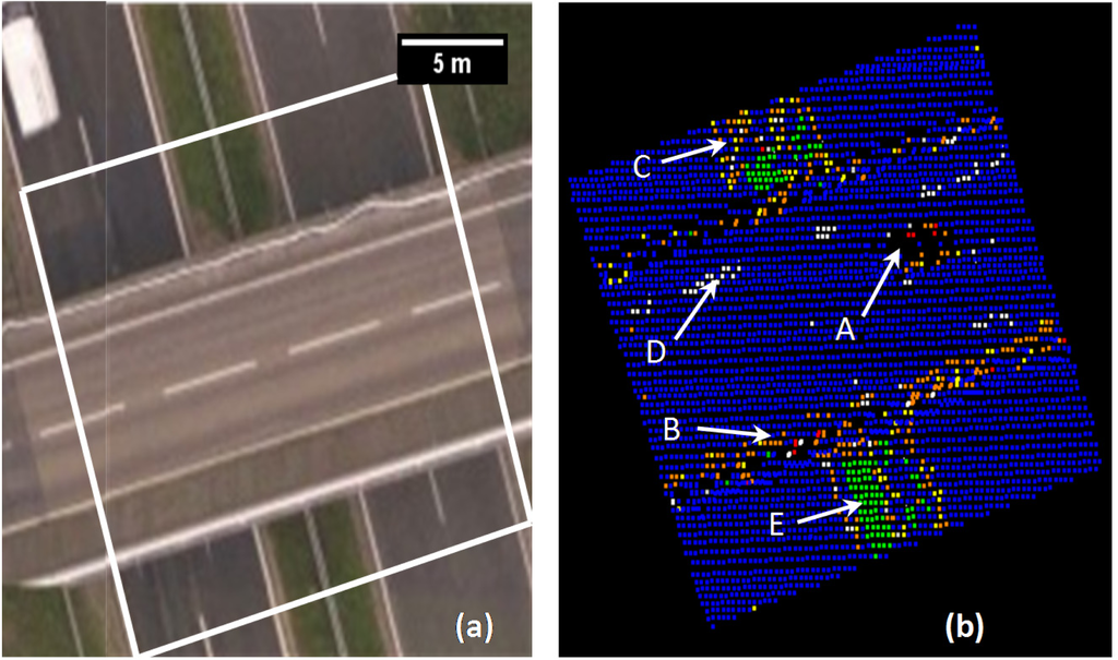 The extended test area covers more than 16 km2 and multiple targets from different regions with various physical properties were selected to test the developed segmentation routine. An example segmentation output is presented in Figure 4, which illustrates interesting results for a road bridge thatincludes various different materials such as asphalt, metal, and grass. It is evident from the segmented point cloud in Figure 4b that a car (labelled “A” in Figure 4b) was captured during the scanning, but this was not present at the instant of image acquisition (Figure 4a). The segmentation routine showed successful detection of the bridge barriers (B) on both sides of the carriageway, as well as the central reservation (C) between the two carriageways on the lower road level. Additionally, the method showed promising results in detecting some of the road markings (D) (represented in white). Figure 4 also exhibits successful segmentation of the grass regions (E) beneath the bridge (represented in green). However, a small number of echoes appear to have been wrongly segmented—possibly due to non-homogeneous properties of target materials (e.g., area around C).