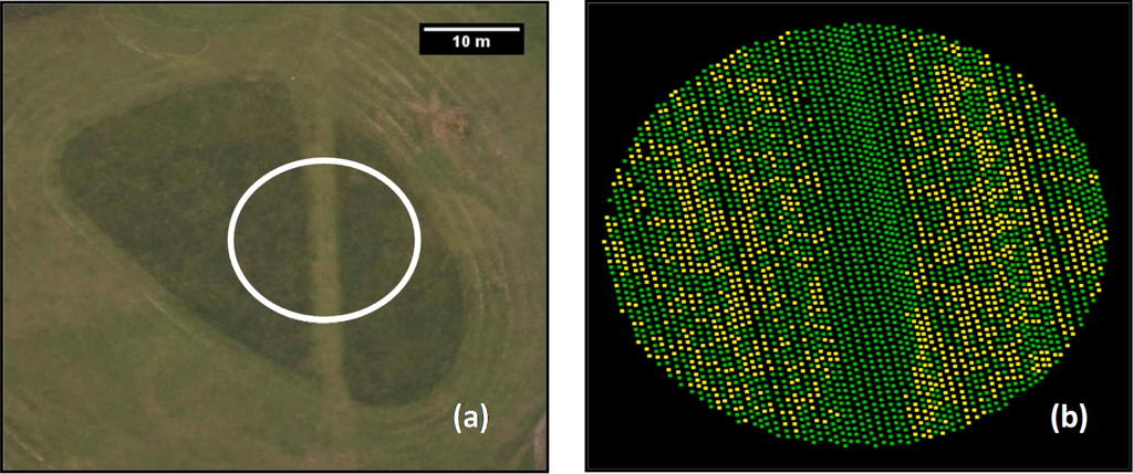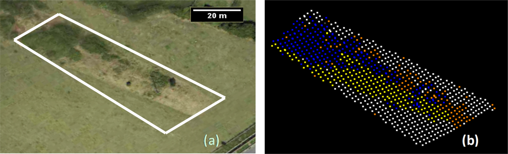 Another example is presented in Figure 6, illustrating a natural terrain target comprising a mound of earth with clumps of vegetation and grass. This demonstrates the performance of the developed method over non-planar surfaces such as natural land coverage which are likely to be partly covered by vegetation. The results show successful detection of the small mound (yellow and orange points that reflect the left and the right sides of the mound due to different orientation/slope) and differentiate this from the semi-flat surrounding ground (white points). Furthermore, the method can distinguish between both sides of the mound and also detect the vegetation patches (blue points) in the upper left corner of the figure.