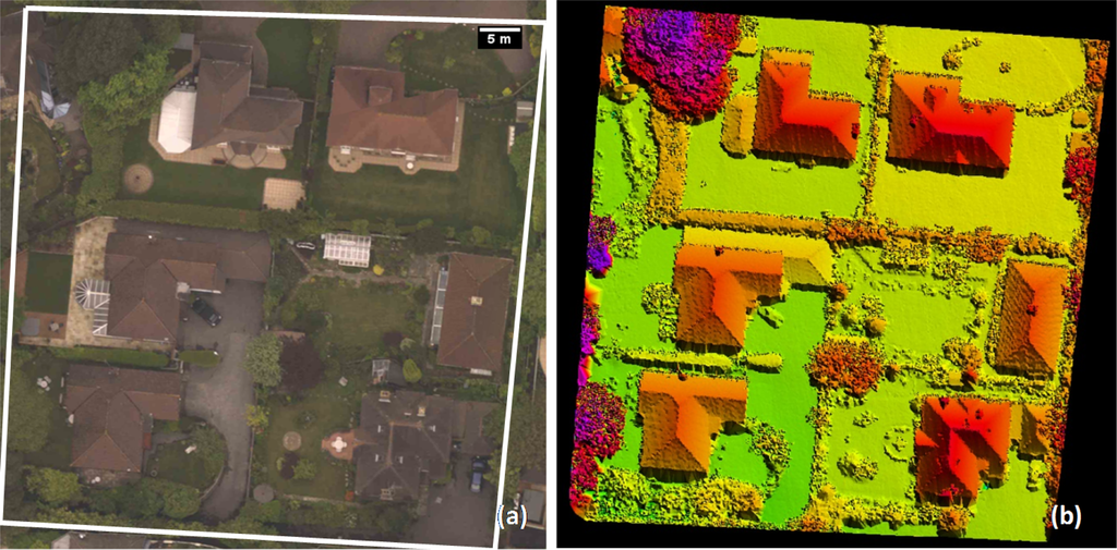This study utilised small-footprint FWF ALS data acquired from a Riegl LMS-Q560 scanner, with a wavelength of 1550 nm. The technical specifications of this system are described in [35]. The test data covers part of the city of Bournemouth, located on the south coast of the UK, and is composed of both man-made and natural land-cover features (Figure 1). The dataset, which was collected from a helicopter platform in May 2008, has an average flying height of 350m. This offers a relatively high point density of approximately 15 points/m2, with a 0.18 m diameter footprint. The ALS campaign was flown in leaf-on conditions with simultaneous colour imagery captured through a Hasselblad digital camera, and subsequently orthorectified with a ground sample distance (GSD) of 0.05 m. The ALS dataset, together with the trajectory information and orthophoto coverage, were provided by Ordnance Survey, Great Britain’s national mapping agency. The raw data were converted from waveforms to point data using the RGD post-processing method, as described by [21], and were transformed from WGS-84 to OSGB36 coordinates (UK National Grid).
