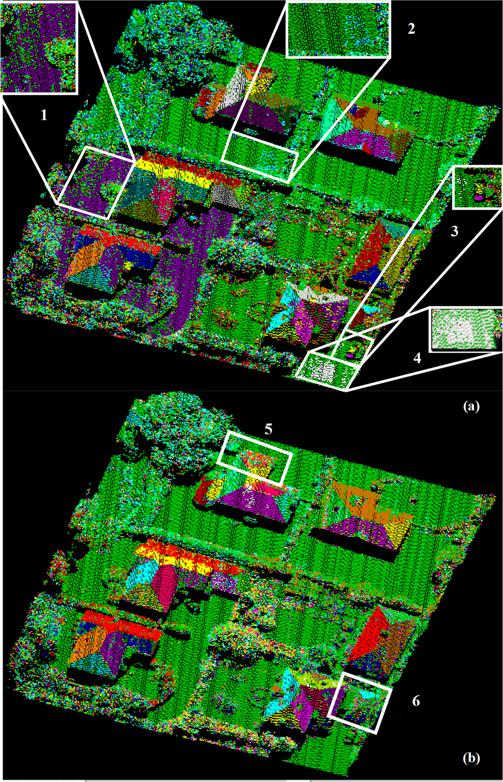 In order to analyse the potential of FWF additional information, the method was applied without integrating FWF physical observables (either in echo amplitude normalisation or in the segmentation process) for the same interest area and otherwise following the same approach. The results are demonstrated in Figure 8b. It can be seen that without FWF additional information, the method failed to discriminate grass from artificial ground. It also failed to deliver meaningful segments for car targets and demonstrated shortcomings in segmenting some roof facets with similar geometric characteristics (same height and slope) but belonging to different surfaces, as highlighted in region 5. The approach also showed poor performance over some roof surfaces where vegetation was found to cover some facets of the roof. In this case, meaningless segments were delivered, such as the example highlighted in region 6. For the same highlighted region, it can also be noticed that over some house roof facets, the integration of FWF additional information delivered more homogeneous segments than those produced without using this information. This behaviour is worth emphasising, as it demonstrates that the RSN method for determining local incidence angle [36], and subsequent incorporation into the segmentation routine, is not overlysensitive to discontinuities.