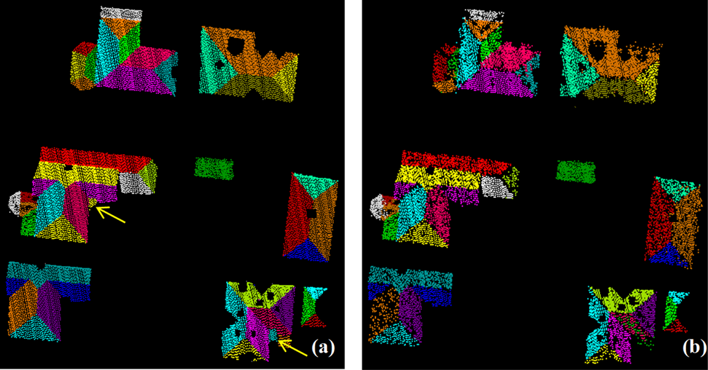 - Awwad, T.M.; Zhu, Q.; Du, Z.; Zhang, Y. An improved segmentation approach for planar surfaces from unstructured 3D point clouds. Photogramm. Rec. 2010, 25, 5–23. [Google Scholar]