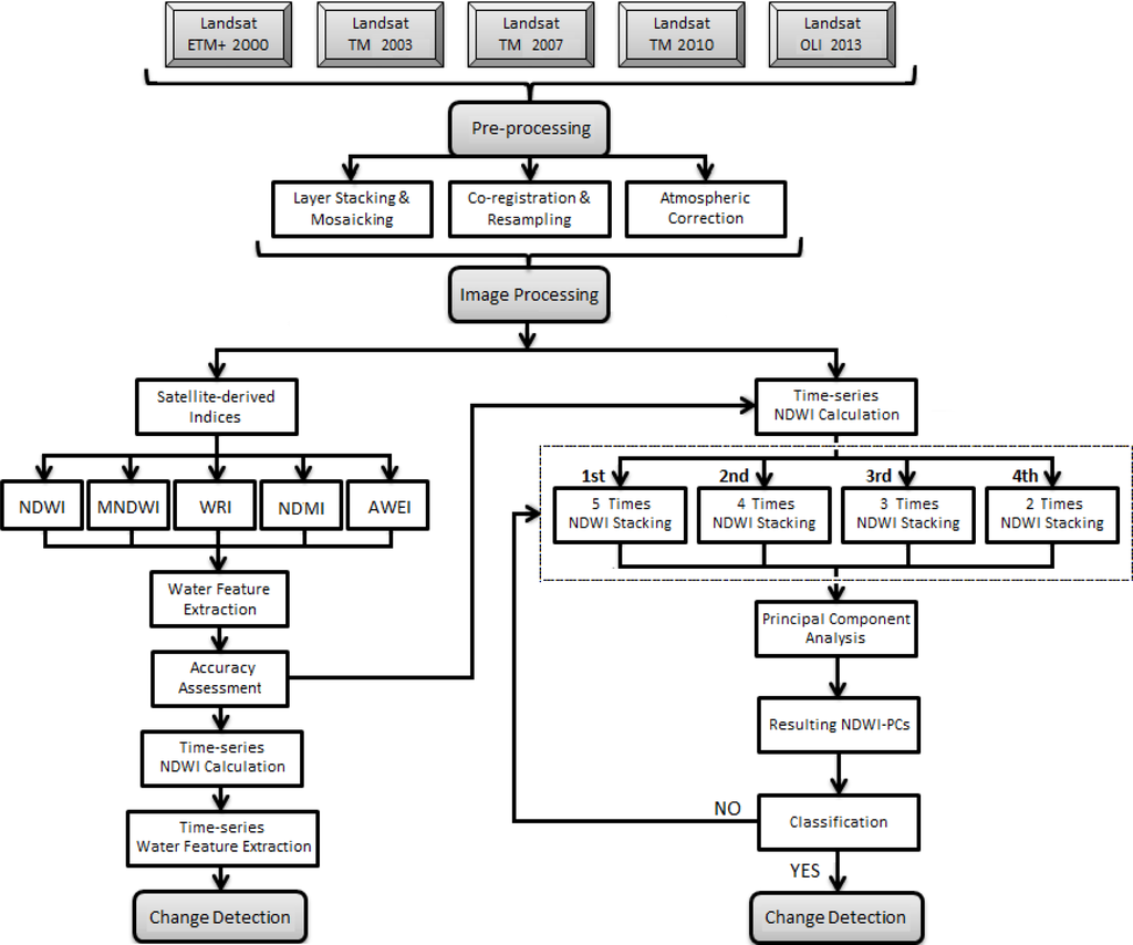 To perform the new NDWI-PCs approach, the NDWI was calculated from the multi-temporal Landsat data. Subsequently, the obtained NDWI images were stacked into one composite file. The Principal Component Analysis (PCA) technique was then performed to transform the composite image into a new PCA space. Finally, the resulting Principal Components of multi-temporal NDWI (NDWI-PCs) were classified and analyzed for detection of the lake surface area changes. The thresholding technique, based on the trial and error method, was manually applied to classify the resulting PCs to detect the changes. The proposed approach was evaluated for detection of the lake water surface changes between five, four, three, and two different times, respectively.