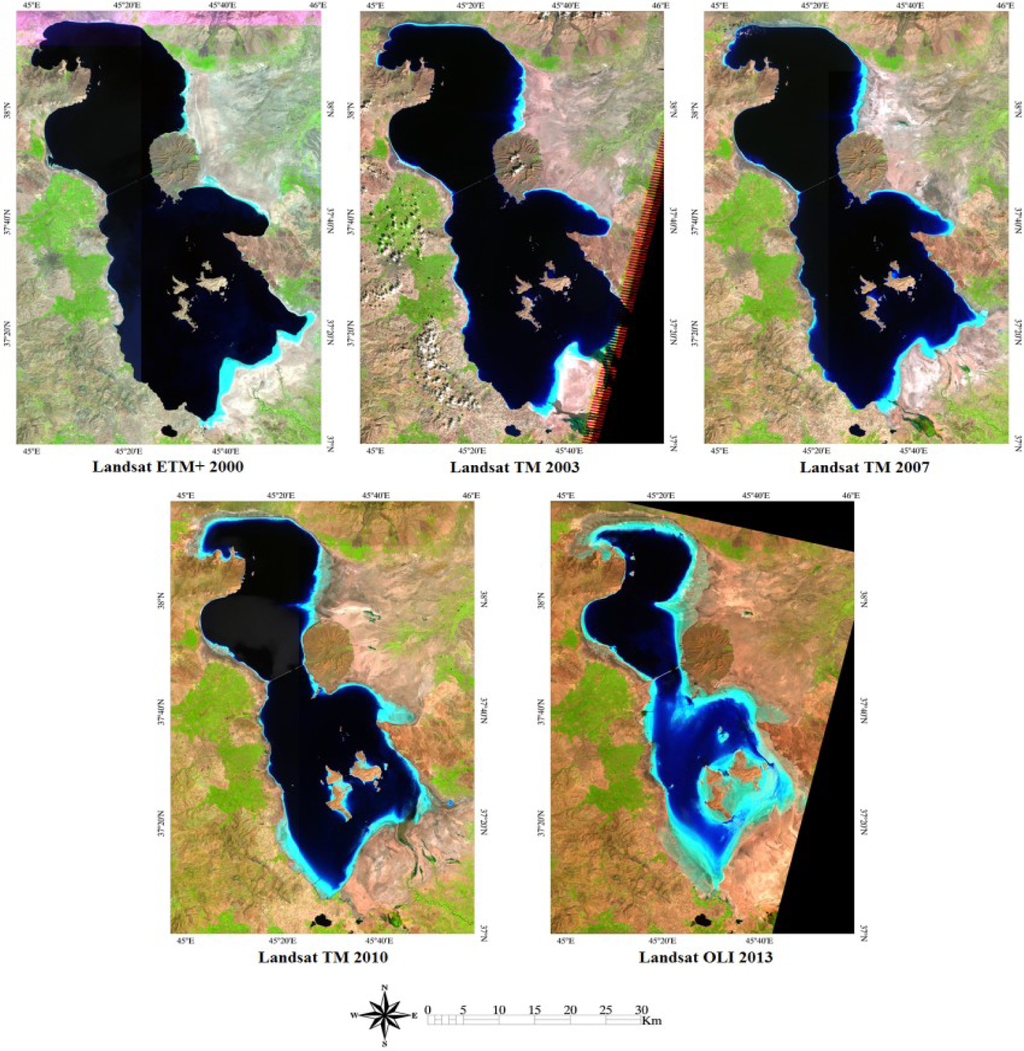 Once the required satellite data were obtained, the image pre-processing techniques were performed to prepare the images for further processing. The dataset after pre-processing are shown in Figure 2. One image for the year 2003 was unavailable in USGS to cover entire the lake in this year. However, the missed area is too small compared with the total surface area of the lake and we tried to reduce the error by adding the missed area to the calculated area of the lake through a simple interpolation.