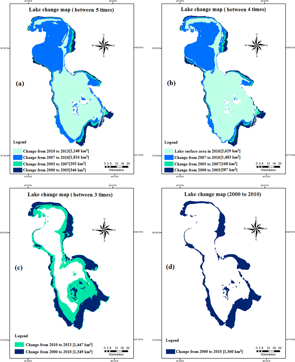The feature extraction technique, identified as the best option for water features extraction, was employed to model the spatiotemporal changes of Lake Urmia in the period 2000–2013 using the multi-temporal Landsat ETM+ 2000, TM 2003, TM 2007, TM 2010, and OLI 2013 images. To achieve this, the selected index was calculated, analyzed and classified independently (using image-specific thresholds) to extract the lake surface area in each year. Finally, the generated maps were overlaid to produce the lake surface area changes map in the period 2000–2013.
