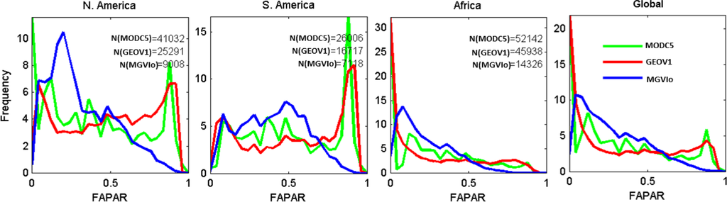 The observed distribution over continents (only three are displayed here) and for the global distribution (Figure 10) show similar features as those observed over the main biome types: relatively good agreement between MODC5 and GEOV1, while MGVIo shows higher fraction of low FAPAR values including very low values.