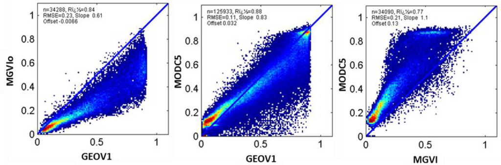 Results show that the use of the closest observation reduces the number of available matches between ground measurements and available products (Table 4). This is mostly obvious for MGVIo where only 18 DIRECT sites could be used because of the larger fraction of missing data as compared to 60 when the products values were interpolated with time. For MODC5 and GEOV1, the performances measured with the “closest” product are very similar to those obtained with the “interpolated” product values (Table 4), except that the RMSE of MODC5 is much higher with the “closest” method. This is explained by the high frequency variability observed on MODC5 temporal profiles that is partly smoothed out using the interpolation method. Emphasis here is therefore on the performances as measured by the “interpolated” method since it allows more data points as well as smoothing out the high temporal variability that is not necessarily targeted when addressing accuracy assessment. The high temporal variability is one of the main components of the precision of the products. Note that the 3 × 3 spatial support already smoothed out the random variability associated to the products at the pixel level.