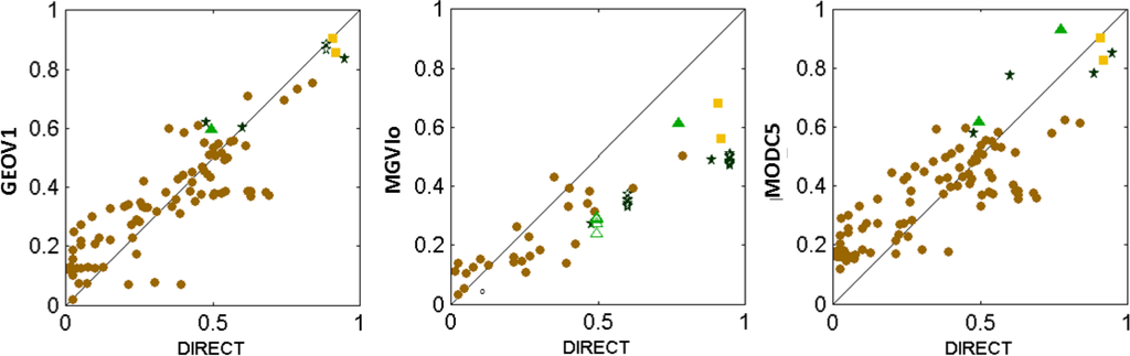 The temporal profiles are produced for each BELMANIP2.1 and DIRECT site. They allow identifying qualitatively the main features of each product. Figure 5 presents a selection of 4 sites corresponding to the four main biomes considered in OLIVE (BELMANIP2.1, Sites number 5, 65, 165 and 320), the other temporal profiles being available in the full OLIVE report (WWW1). The temporal profiles show a general agreement of the seasonality for the non-forest and deciduous broad leaf forest sites (Figure 5). For the needleleaf forest and evergreen broadleaf forest, we observe some discrepancies, particularly for MGVIo, which shows more missing observations confirming the previous results on continuity assessment. MODIS and MGVIo show also high frequency variations associated to the shorter temporal resolution as compared to GEOV1. However, one of the main features observed is the difference in magnitude for MGVIo that shows almost systematically lower FAPAR values. This was already reported in previous studies [23,36–39] and could be explained mainly by differences in algorithm design where different assumptions on canopy structure and leaf optical properties are used.