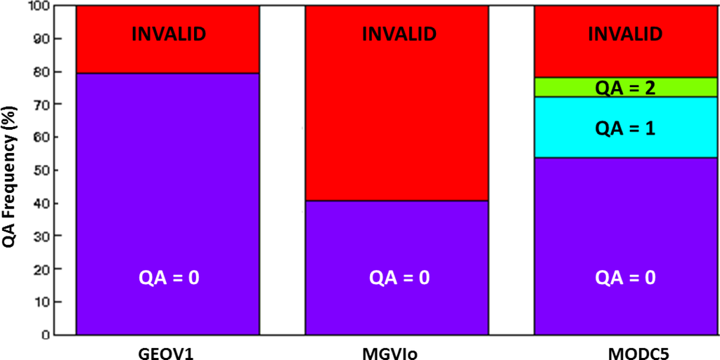 The global distribution is detailed per QA level (Figure 2) and shows that GEOV1 and MODC5 provide product values in most situations, whereas MGVIo shows a large fraction of invalid data. Note that the back-up algorithm (QA = 2) for MODIS is used in about 5% of the cases, whereas the main algorithm is under saturation situations (QA = 1) in about 20% cases.