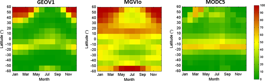 The spatio-temporal distribution of the fraction of invalid data is computed for each product at the monthly time step and per 10° latitude strips (Figure 3). As expected, it decreases around the equator because of large occurrence of clouds, as well as for the higher latitudes for GEOV1 and MGVIo due to short day length and poor illumination conditions in addition to the cloud occurrence. This is not observed for MODIS because of the exploitation of the replication of views for the higher latitudes that are fully exploited, in agreement with the results reported by [65].