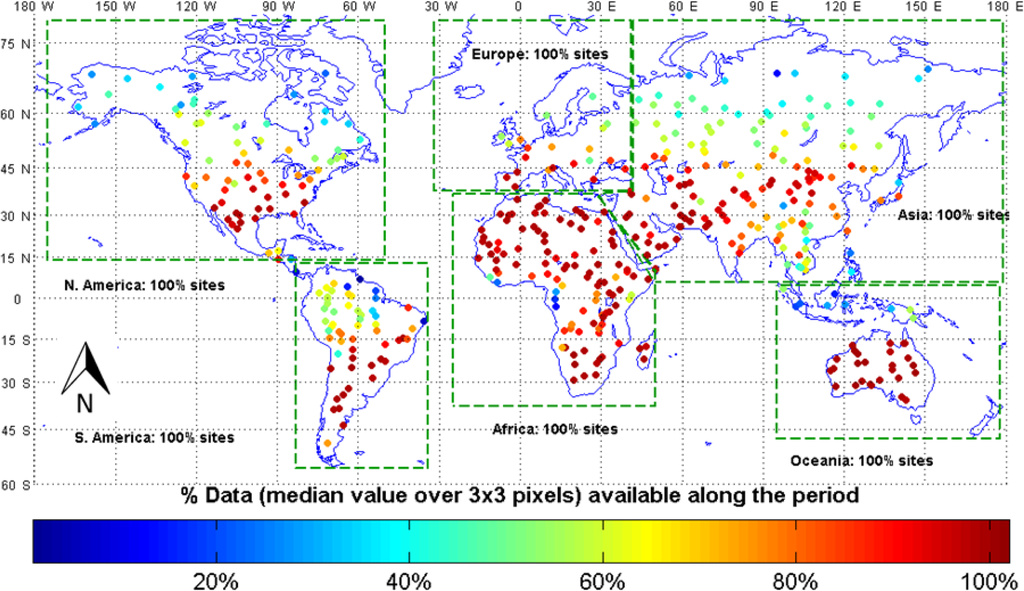 The fraction of valid data is also evaluated per continent and site (Figure 4) and per biome type. The GLOBCOVER biome classification is used [42,43] with the classes being aggregated into larger biome types comprising of Evergreen Broadleaf Forest (EBF), Evergreen Needleleaf Forests (ENF), Deciduous Broadleaf Forest (DBF) and Non Forest (NF). GLOBCOVER was chosen in order to be consistent with the BELMANIP2 site selection and homogeneity verification. However, considering the broad categorization of the vegetation after aggregation, the impact of using a different land cover map should be marginal. The results on the distribution of the fraction of valid observations per biome type showed good consistency with the spatio-temporal distribution (Figure 3) and is detailed in the OLIVE validation report. It can be noted also that in recent years, smoothing and gap filling methods were developed to overcome the problem of missing data [16,66–68].