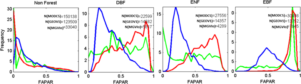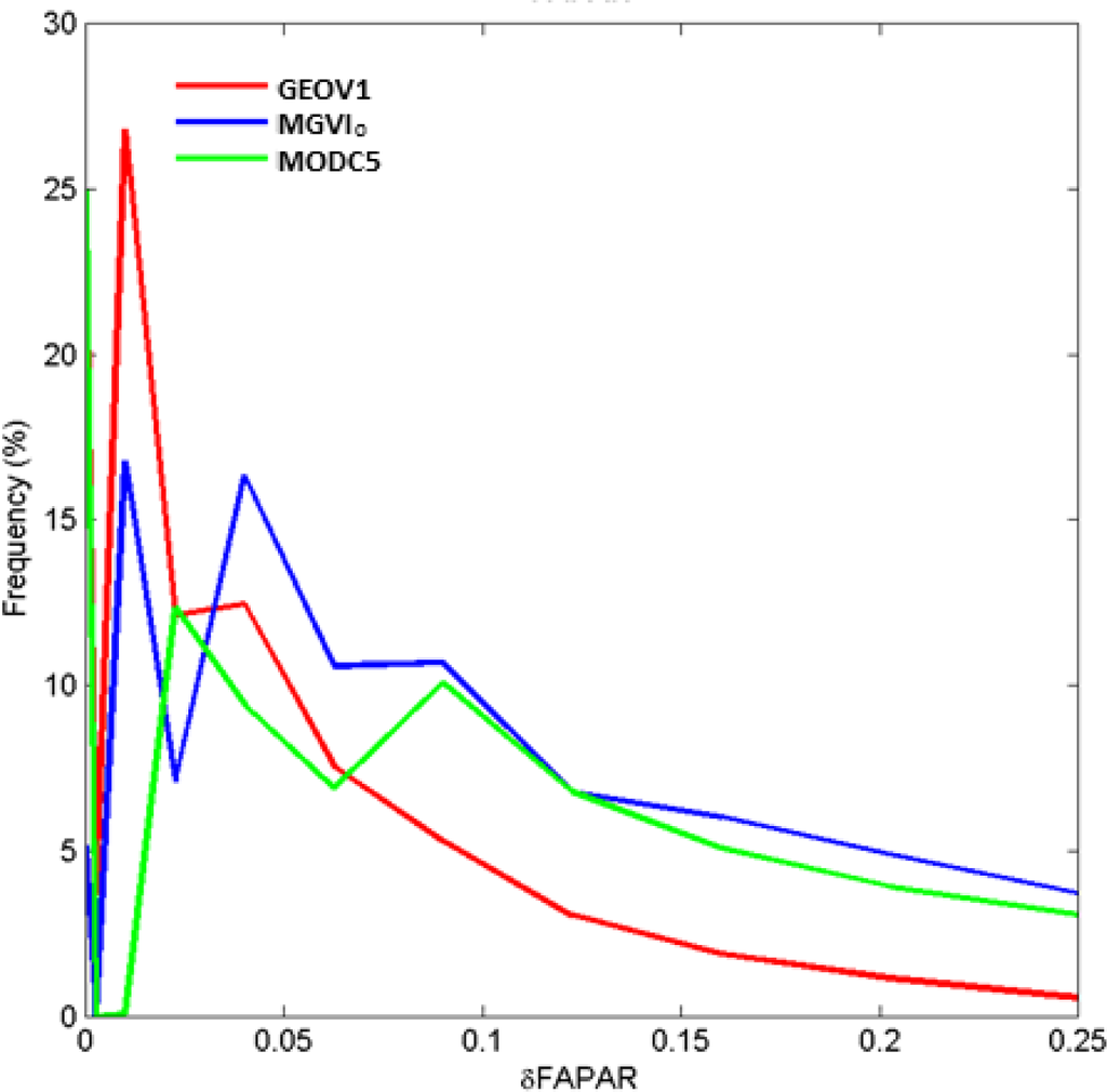The histograms (probability density function) of each product were computed for the 4 main biome types (NF, DBF, ENF and EBF) over the valid pixels within the 49 × 49 pixel window centered over all the BELMANIP2.1 sites for the valid dates and for the considered period (Table 3) using the original temporal sampling (Table 2). Results show that MODC5 and GEOV1 have similar distributions while some differences are observed for Evergreen Needleleaf Forests (Figure 9). MODC5 shows an unexpected large number of almost bare soil situations. This is probably due to a misclassification of pixels into bare area, for which the MODIS algorithm is not triggered, and that were set to null FAPAR value in OLIVE. Conversely, GEOV1 shows a pronounced mode for high values of FAPAR. MGVIo modes are systematically shifted towards the low FAPAR values except for the Non Forest sites (Figure 9). Further, maximum FAPAR values for the forest biomes hardly reach FAPAR = 0.8 although such biomes, which have an almost complete cover fraction in many situations, should show higher values of FAPAR. In addition, the significant fraction of almost bare soil situations seen in GEOV1 and MODC5 for the Non Forest sites (Figure 9) is not seen by MGVIo.