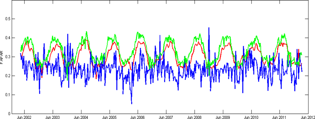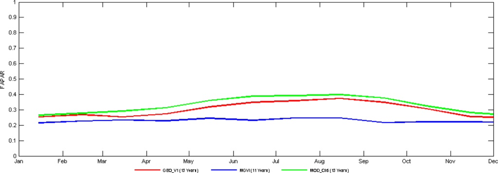 MODISC5 FAPAR product corresponds to the instantaneous value at the time of the satellite overpass. FAPAR values are first produced daily. Then, the 8 days composite corresponds to the values of the product when the maximum FAPAR value within the eight day period is observed. Note that FAPAR values are not retrieved over bare and very sparsely vegetated area, permanent ice and snow area, permanent wetland, urban and water bodies.