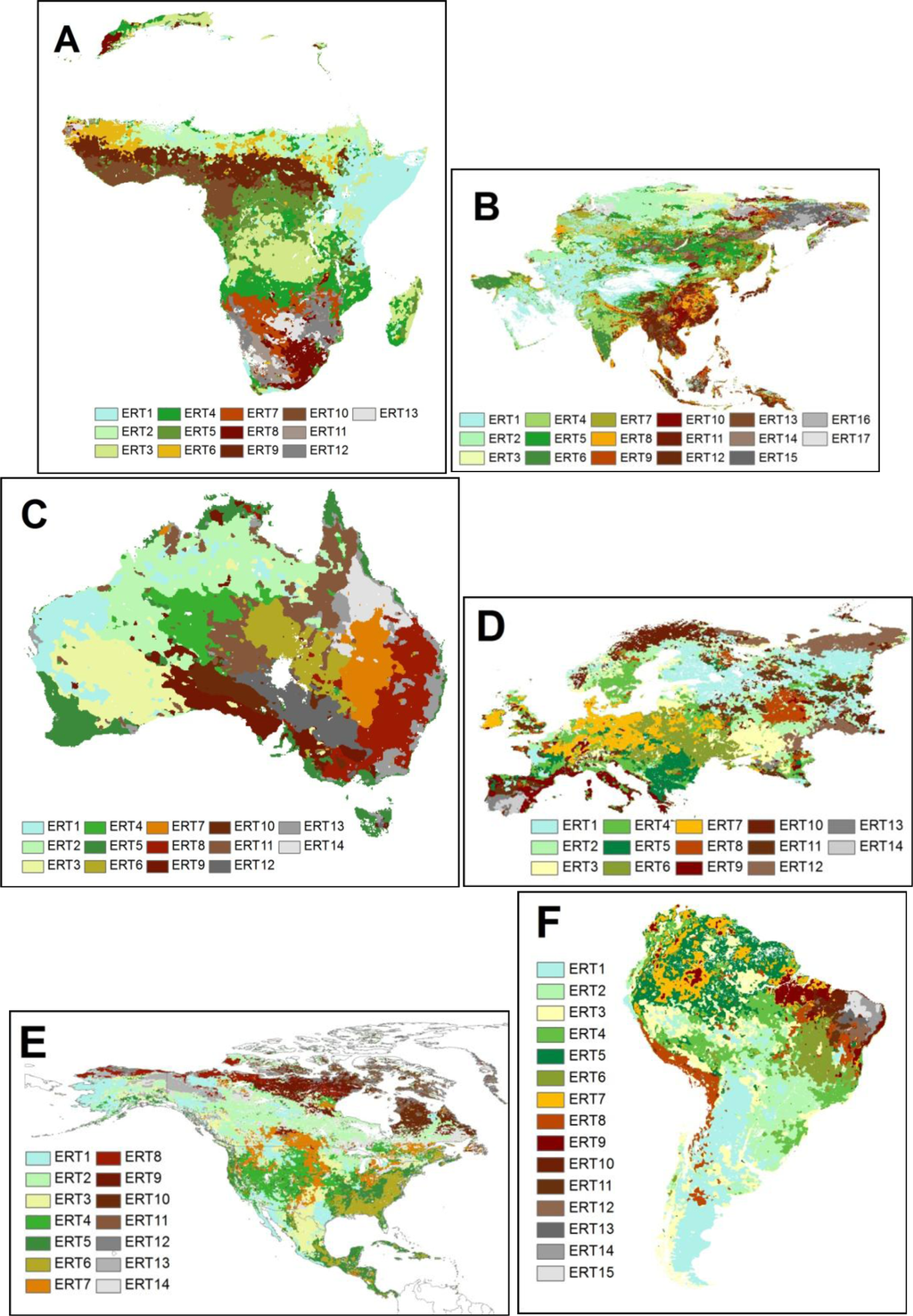 To aid the interpretation of results in how ecosystems reflect global climatic changes, the Köppen climate classification [] was used. Land use and management on the global scale was addressed by using the Land Use Systems (LUS) maps of the world produced by the United Nations Food and Agricultural Organization []. The LUS classification includes several layers as the Global Land Cover dataset (GLC 2000), maps indicating cropping patterns (e.g., dominant crop types), livestock data, major ecosystem types, biophysical resources base layers (e.g., temperature regime, length of growing period, dominant soil units and terrain information) and socio-economic attributes. All classes of the Köppen and the FAO LUS classification were included in the analysis, as the main interest of the study was to compare their explanatory value with the ERTs at the most detailed thematic level.