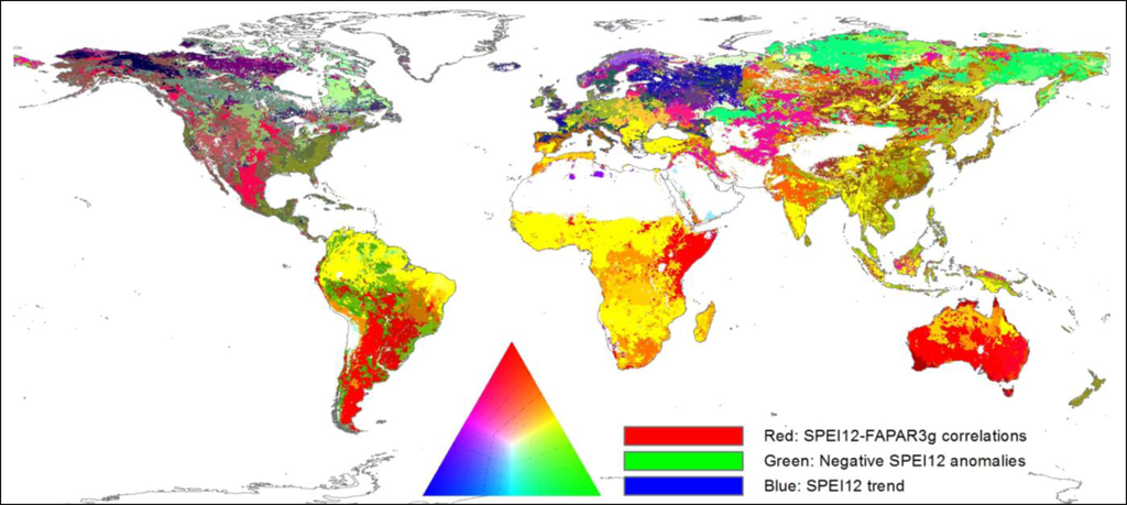 Figure 2 presents the red-green-blue color composite of the SPEI12-FPAR3g correlation (R, red channel), the trend in the SPEI12 anomalies (TrdS, green channel) and the strength of the negative SPEI12 anomalies (SLT0, blue channel). Red and orange toned ERTs represent areas with positive correlation between the SPEI12 and FPAR3g anomalies with anomalies being mostly negative and where trends in the SPEI12 are also negative. Thus, these areas were affected by several drought events between 1982 and 2011 with a strong negative effect on the vegetation, and the severity of the drought events also increased over these 30 years. These ERTs are found mostly in the Southern Hemisphere, notably over the southern part of Latin America (mostly over Argentina), the Horn of Africa and the southern part of Australia.